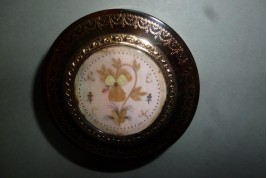 Tabatière en écaille monture laiton doré ou cuivre, le couvercle comportant un médaillon sous verre en ivoire teinté peint et appliqué d'une pensée en marqueterie de paille